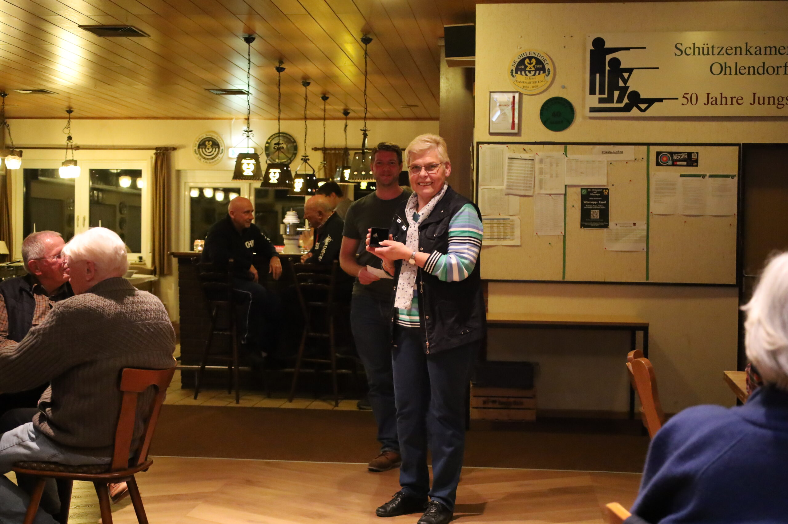 Den ersten Platz des Schweineschießens der Schützenabteilung belegte Helga Sahling mit einem unglaublichen Gesamtteiler von nur 278 (Preis: 15 Kilo Fleisch und den neu gestifteten Schweineorden), gefolgt von Herbert Menke (294) und Wolfgang Franke (306). Insgesamt wurden 32 Preise verteilt, die vom Vereinsmitglied und Schlachter Stefan Schantini organisiert und im Anschluss nach Wunsch in Kühlfachfreundliche Stücke filetiert wurden.